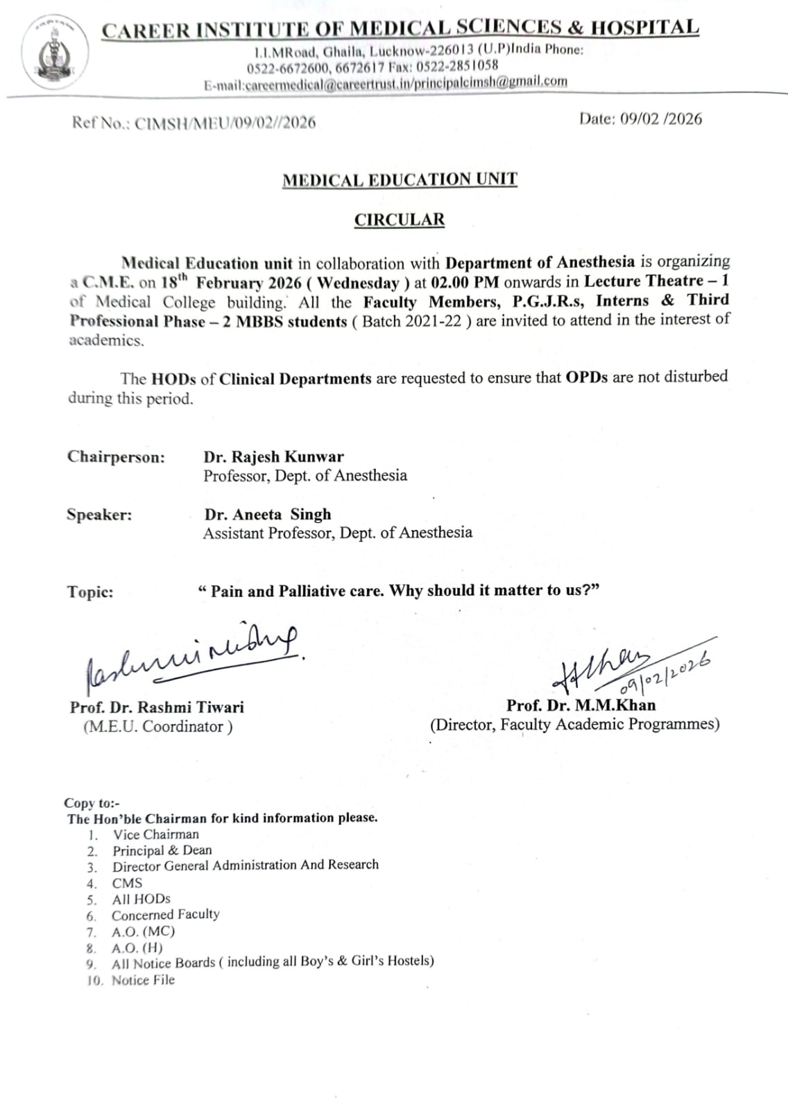Career Institute of Medical Sciences & Hospital, Lucknow was established in 2011 with the approval of the Ministry of Health and Family Welfare Government of India.